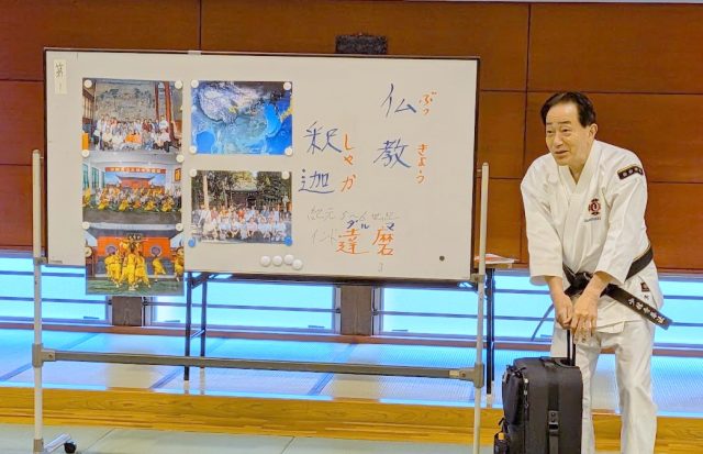 16年前に訪れた中国河南省嵩山少林寺の写真を示しながら、仏教伝来と達磨大師の話をしました。