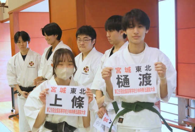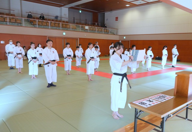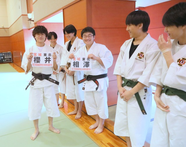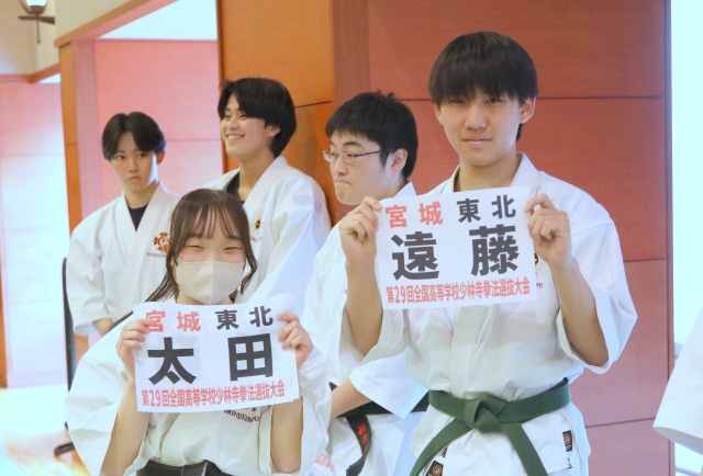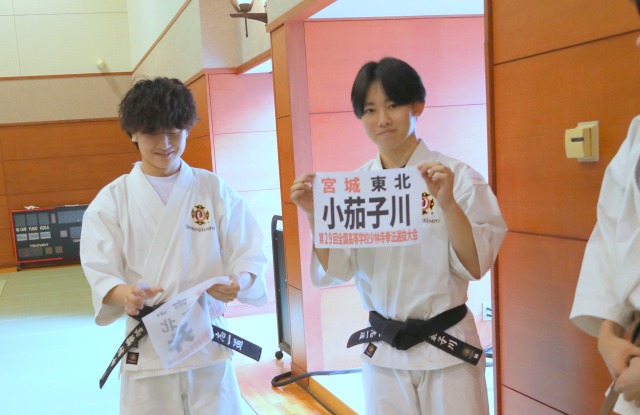 インターハイで男子組演武準優勝、男子団体第4位の先輩方から、ゼッケンを手渡してもらいました。